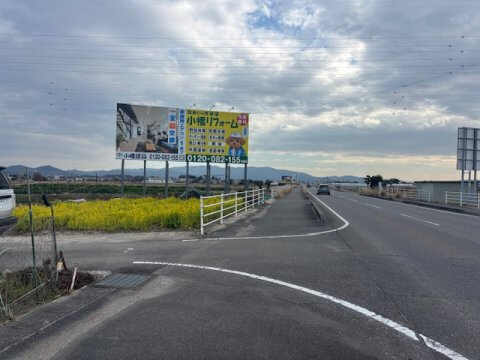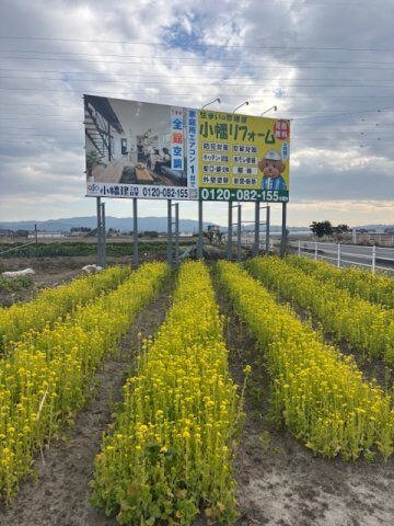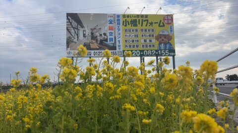 黄色の菜の花と小幡リフォームの看板のコラボ