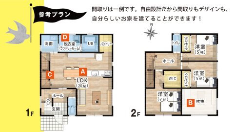 間取りは一例です。自由設計なので、パントリーやランドリールームなど、共働きに嬉しい「家事ラク動線」も思いのまま 。